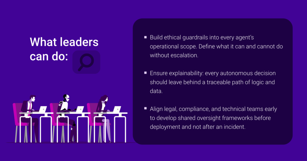 The answer lies in governance by design. As Harvard Business Review notes, AI agents already deployed in enterprise workflows are surfacing new ethical questions, especially when decisions happen without a human in the loop. Meanwhile, regulators are beginning to scrutinize AI explainability, transparency, and fairness as essential business obligations, not just technical concerns. With legislation tightening globally, agentic AI can’t just be auditable; it must be intentionally constrained and context-aware.