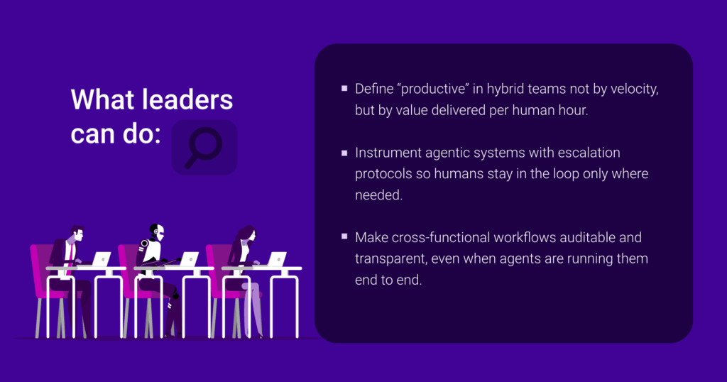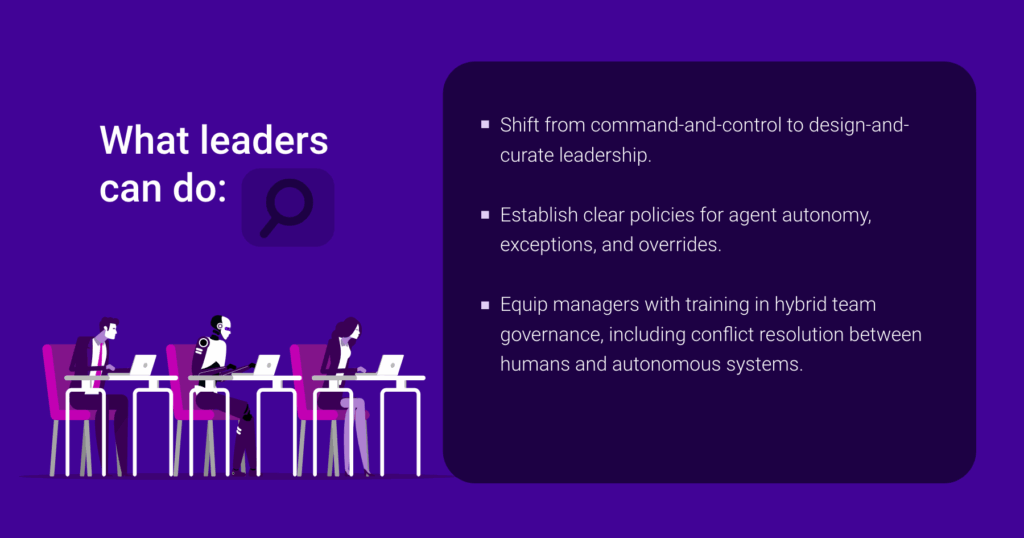 This isn’t hypothetical. As Harvard Business Review recently noted, leaders in AI-forward organizations are already pivoting toward what they call “collaborative intelligence models,” where their role is to create the conditions for human-agent collaboration, not dictate the execution. That means defining escalation paths, clarifying decision boundaries, and establishing when and where human judgment is required. Leaders don’t need to compete with agents on efficiency. They need to curate the systems in which agents can succeed without eroding trust or clarity.