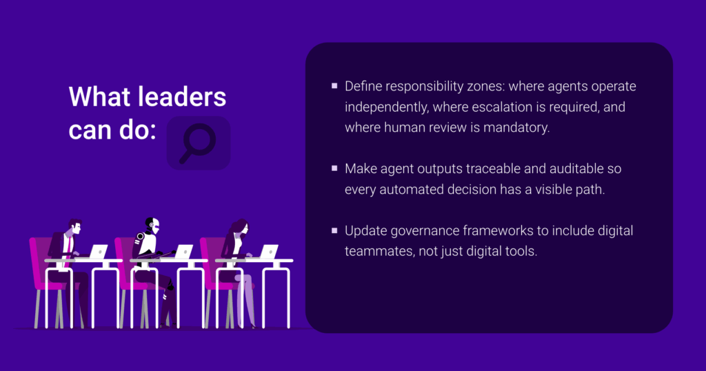 When a teammate takes action without being told, the question isn’t just “What got done?” It’s “Who’s responsible?” Agentic AI systems that reroute workflows, reprioritize escalations, or initiate communications blur traditional lines of accountability. If the outcome is positive, who gets credit? If something breaks, who takes the fall? These aren’t philosophical questions; they’re operational ones.